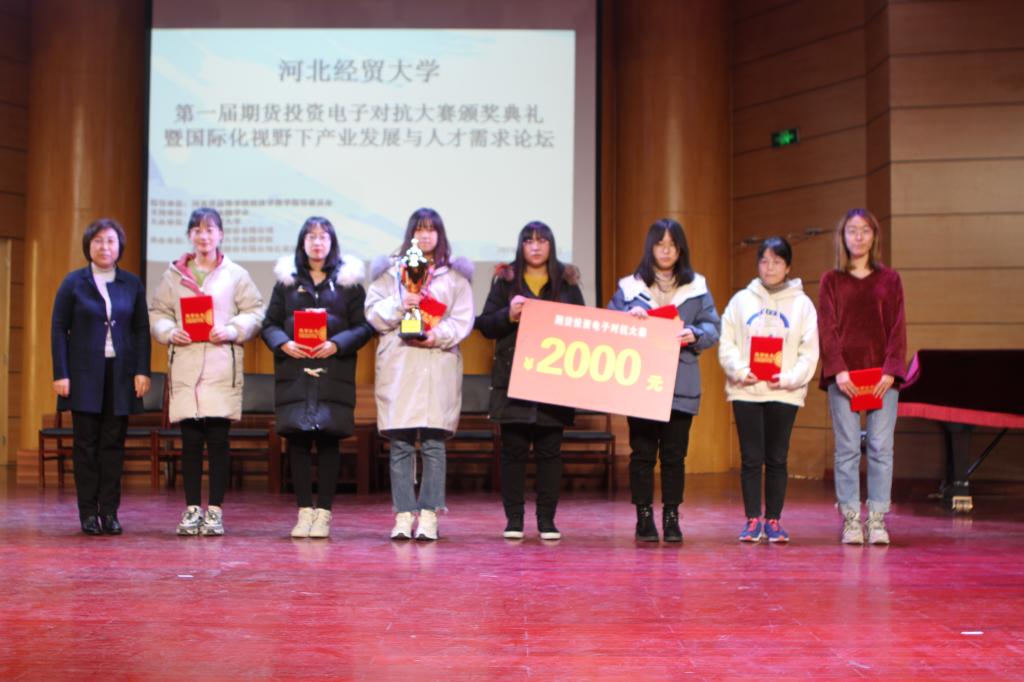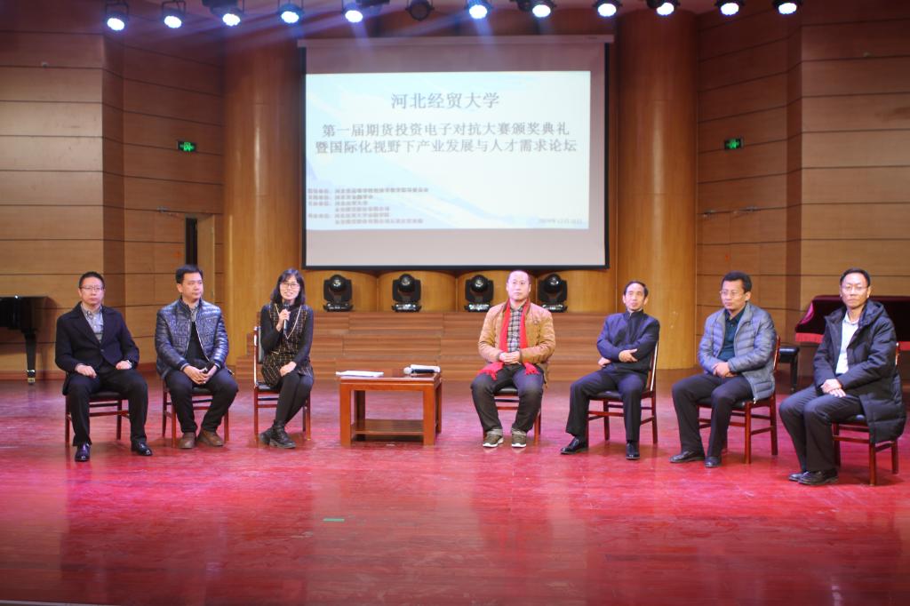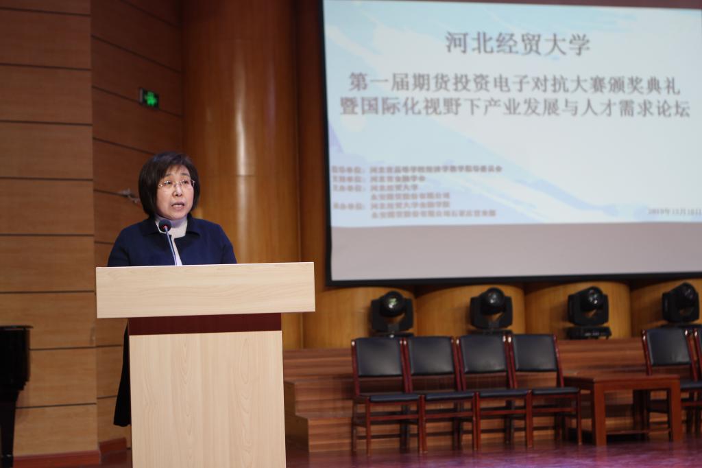 12月10日下午,beat365官网在音乐厅举办第一届期货投资电子对抗大赛颁奖典礼暨国际化视野下产业发展与人才需求论坛,校党委常委、副校长程瑞芳出席并致辞。来自香港交易所、永安期货股份有限公司等多家期货相关企业负责人以及河北师范大学、石家庄铁道大学、河北地质大学等高校的专家学者参加本次论坛,beat365中文官方网站师生300余人现场聆听。