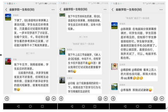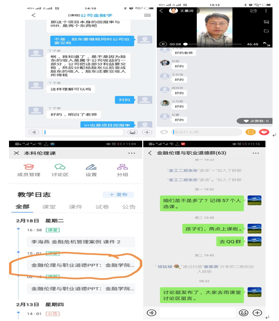 虽然远程教学是大多数老师们首次尝试的教学方式,但是大家并没有因此而忽视授课效果,而是比以往课堂教学更加关注学生们的学习状态,在上课过程中根据学生们的学习情况,及时调整自己的教学方案,为达到更好的教学效果,尽可能采用多种教学手段开展混合式教学。如王重润教授的《公司金融》采用尔雅视频直播+提问互动答疑方式,同时在课前录制速课,与学习资料、课件等一同上传到群里,让学生课前学习,课中讨论,学习氛围浓郁,讨论区学生提问踊跃。李海燕教授的《金融伦理和职业道德》课程采用QQ平台上课与雨课堂作业和讨论交流相配合教学模式,教学效果良好。