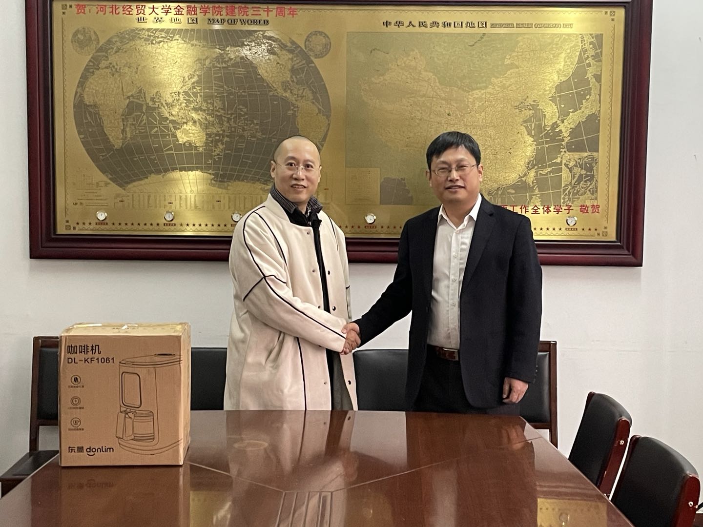 12月28日上午,2003届毕业生--永安期货石家庄营业部总经理王吉元重返母校,为beat365官网捐赠了咖啡机,在学院会议室举办了简短而热烈的捐赠仪式。beat365中文官方网站院长王重润出席捐赠仪式。