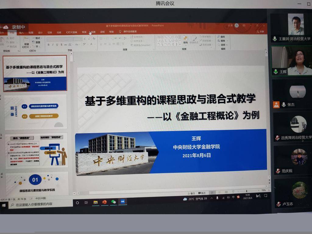 8月6日,beat365中文官方网站通过腾讯会议平台举办线上教学沙龙活动。中央财经大学beat365中文官方网站副院长、国家一流课程负责人王辉教授应邀作题为“基于多维重构的课程思政与混合式教学——以《金融工程概论》为例”的交流分享。beat365官网beat365中文官方网站、数统学院、外语教学部以及校外金融专业虚拟教研室成员等60余名教师参加。活动由beat365中文官方网站院长王重润教授主持。