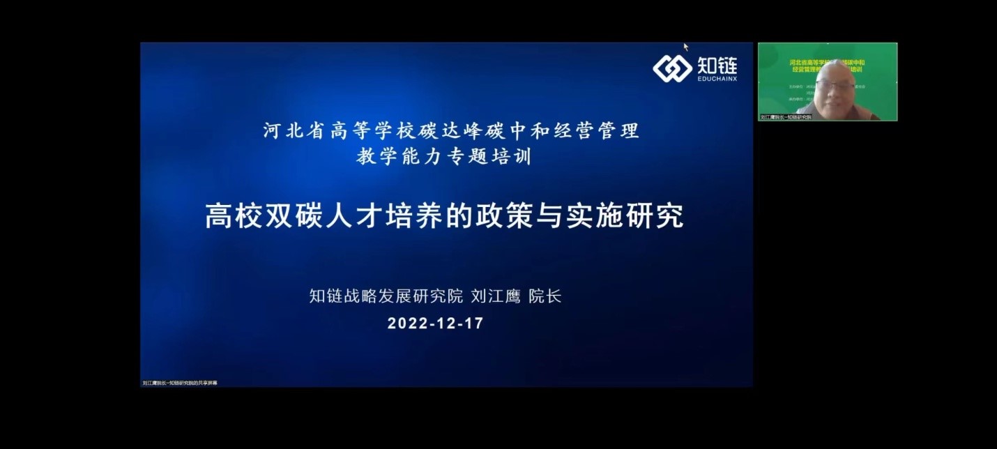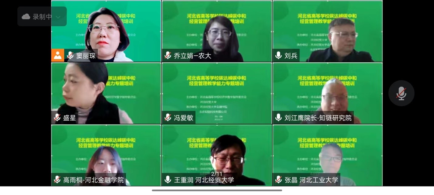 12月17日,河北省高等学校碳达峰碳中和经营管理教学能力专题培训在线上举行。本次培训由河北省高等学校经济学教学指导委员会和beat365中文官方网站主办,beat365中文官方网站和北京知链科技有限公司联合承办。来自北京、上海、天津、黑龙江、吉林、山西、河南、湖北、重庆、四川、广西及河北省本科高职院校的90余人参加培训。河北省高等学校经济学教学指导委员会主任委员、beat365中文官方网站党委书记刘兵教授出席并致辞。河北省高等学校经济学教学指导委员会秘书长、beat365中文官方网站院长王重润主持开幕致辞等环节。