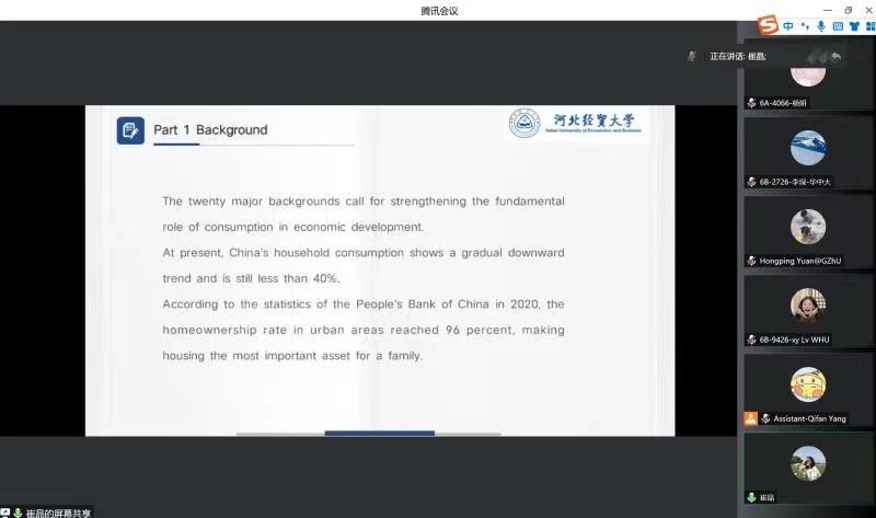 会议中,杨妍同学汇报了题为《Research on the impact of housing liquidity on household asset allocation》的英文学术报告,论文在分析房价与流动性共同对家庭资产产生影响的基础上,将住房流动性指标的刻画作为重点,探究住房流动性对家庭住房资产配置影响,同时进一步探究预期收益与家庭风险态度的机制影响,为释放住房流动性、盘活财富存量提供了政策依据。
