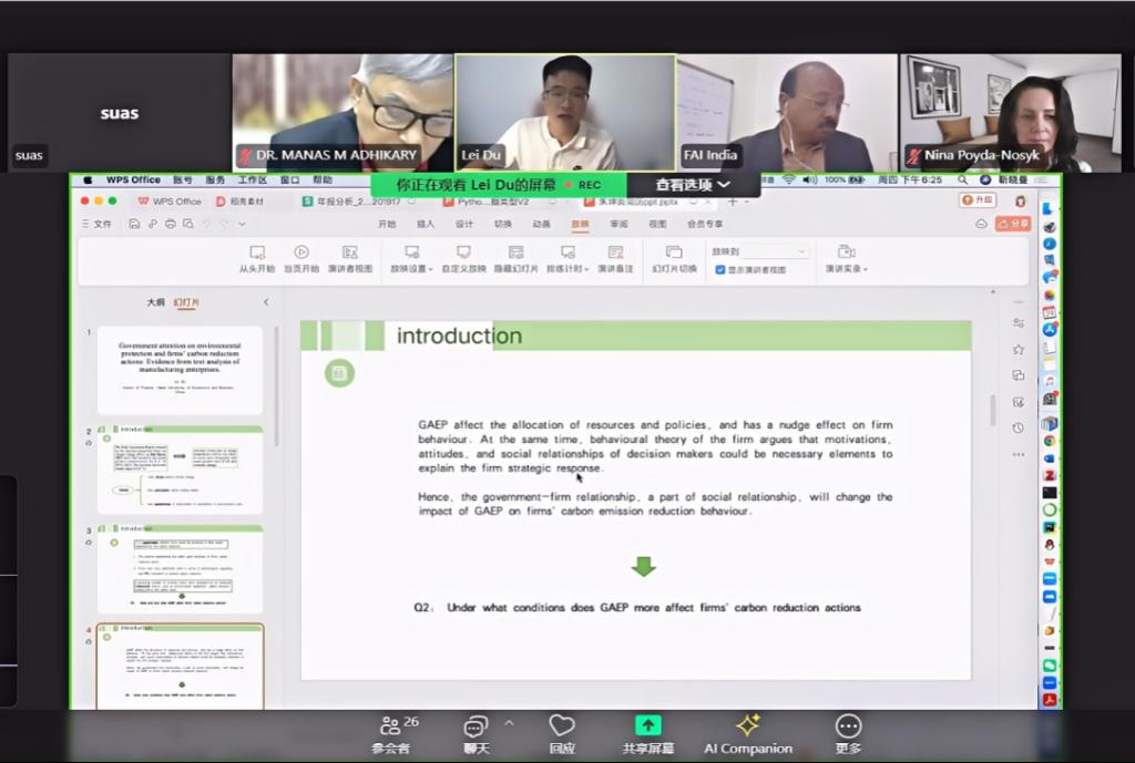 杜磊老师的报告《Government Attention on Environmental Protection and Firms’Carbon Reduction Actions: Evidence from Textual Analysis》(政府对环境保护的重视与企业碳减排行动:来自文本分析的证据)聚焦政府环保关注度(GAEP)与企业碳减排行动的关系。他以2012-2021年中国制造业上市公司数据为样本,运用文本分析方法展开研究。结果显示,GAEP的提升有效推动企业加大碳减排力度,并发现,这一过程中环境补贴配置得到优化,政企关系起到正向调节作用,且对国有企业以及中国东部和中部地区企业的影响更为显著。