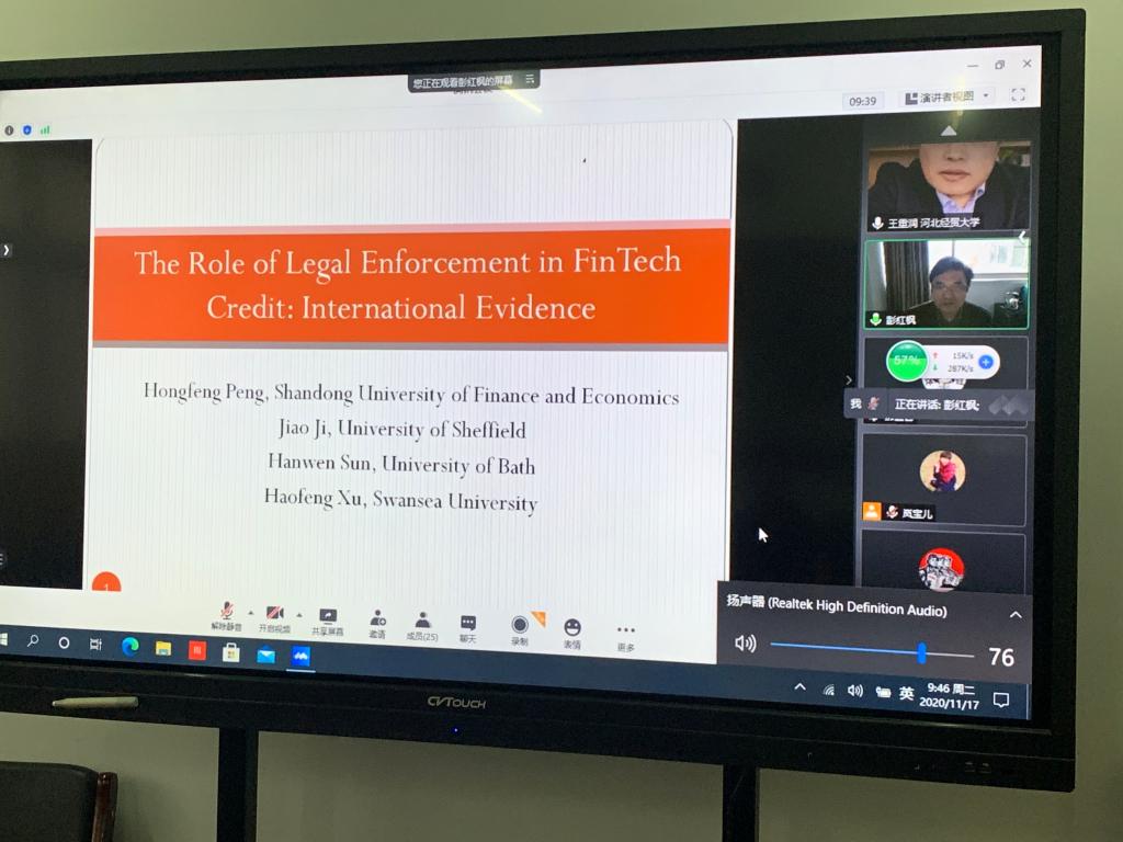 11月17日上午9点45分,beat365中文官方网站邀请山东财经大学金融学院院长、教授、博士生导师彭红枫做题为“The Role of Legal Enforcement in FinTech Credit: International Evidence”的线上学术报告。beat365中文官方网站部分教师和各专业研究生40余人参加了报告。本次报告由beat365中文官方网站院长王重润主持。