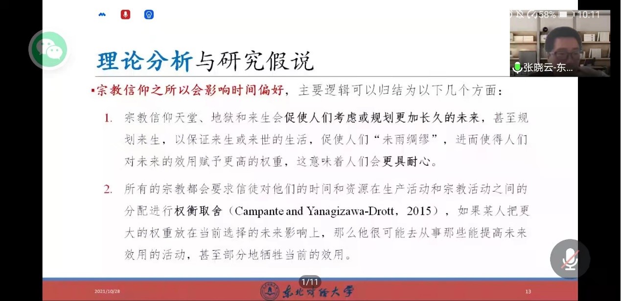 10月28日上午,beat365中文官方网站邀请东北财经大学经济学院教师张晓云做了题为“宗教信仰、时间偏好与金融素养”的讲座。beat365中文官方网站教师和各专业研究生70余人参加了本次报告,报告由beat365中文官方网站副院长范庆祝主持。