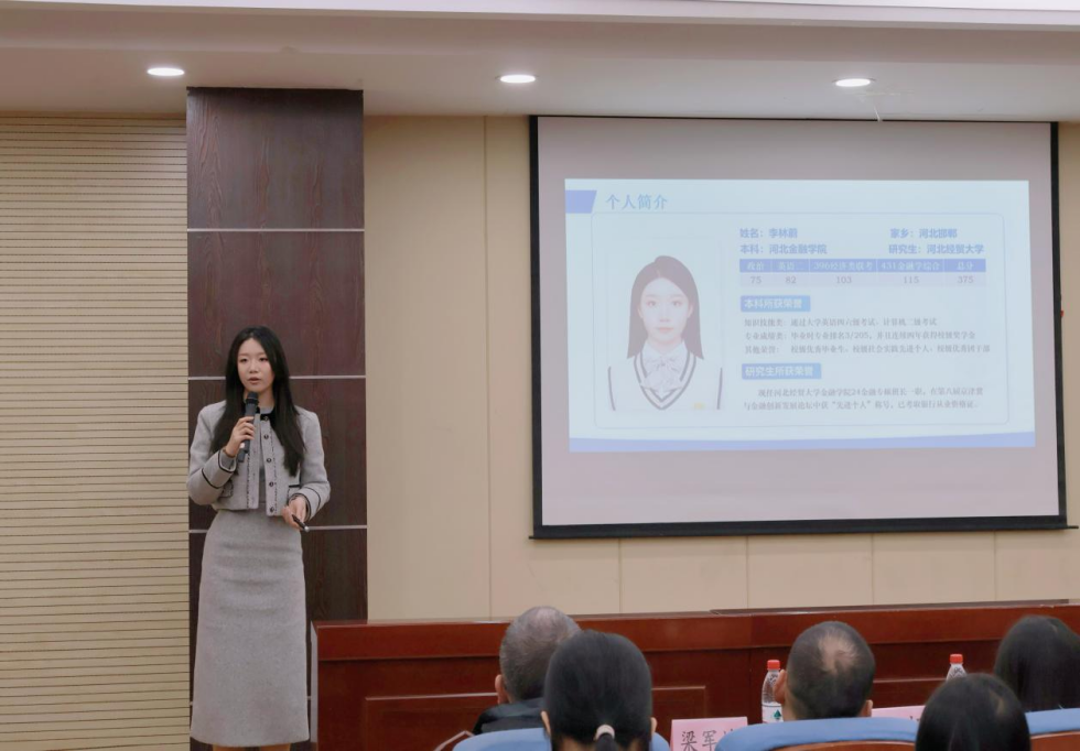 2024年11月22日,beat365官网beat365中文官方网站赴石家庄学院开展研招宣传与考研经验分享活动,石家庄学院经济管理学院院长石永贵、副院长宋晓华、beat365官网副院长范庆祝出席。beat365官网2024级金融专硕李林蔚做考研经验分享,石家庄学院金融工程专业100余名同学参加。